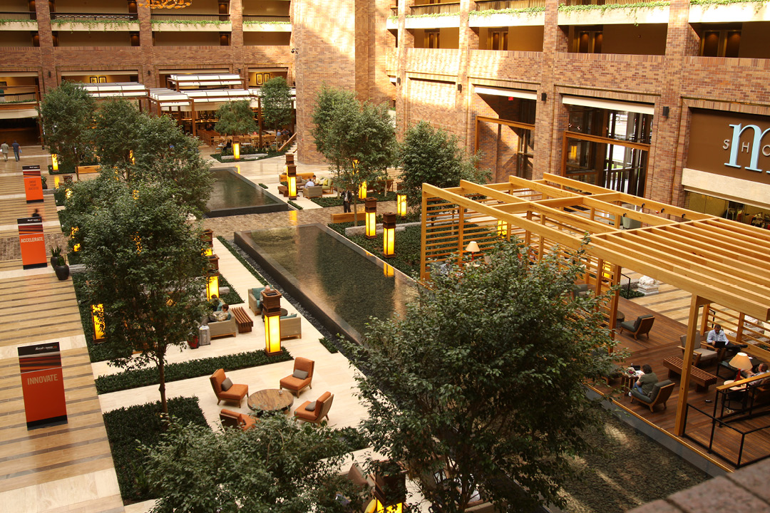 ANDRES completed two projects at the Hilton Anatole; the Media Bar and the atrium. The media bar includes a kitchen, private dining room, lounge, bar, and interactive floor projector. The 8,000-square- foot, 284-person bar is located in the Grand Atrium and is known for its contemporary American cuisine, beers, and cocktails. The atrium, which includes a reflection pool, was featured as the 2011 backdrop for the Major League Baseball Winter Meetings.
