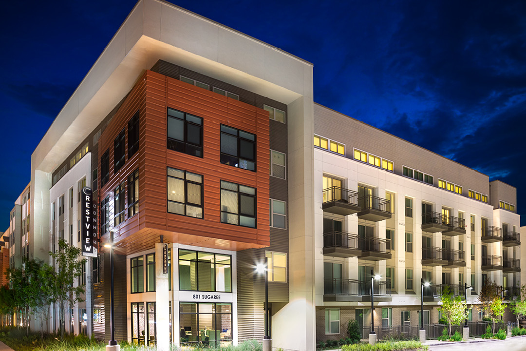 The 4-story complex contains 353 one, two, and three-bedroom units ranging from 642 to 1,405 square feet. Crestview Commons also includes numerous amenities such as a dog park, a resort-style pool with grilling areas, a relaxation courtyard, and a rooftop lounge with views of downtown Austin.