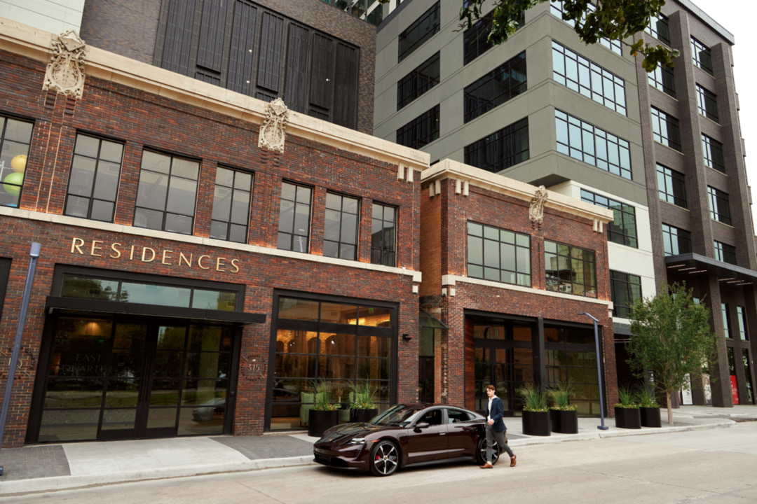 The 20-story mixed-use tower includes 336 apartments, 180,000 square feet of office space, 25,000 square feet of ground-floor retail, a fitness center, and a private bar for tenants. This project preserved two buildings from the 1940s.