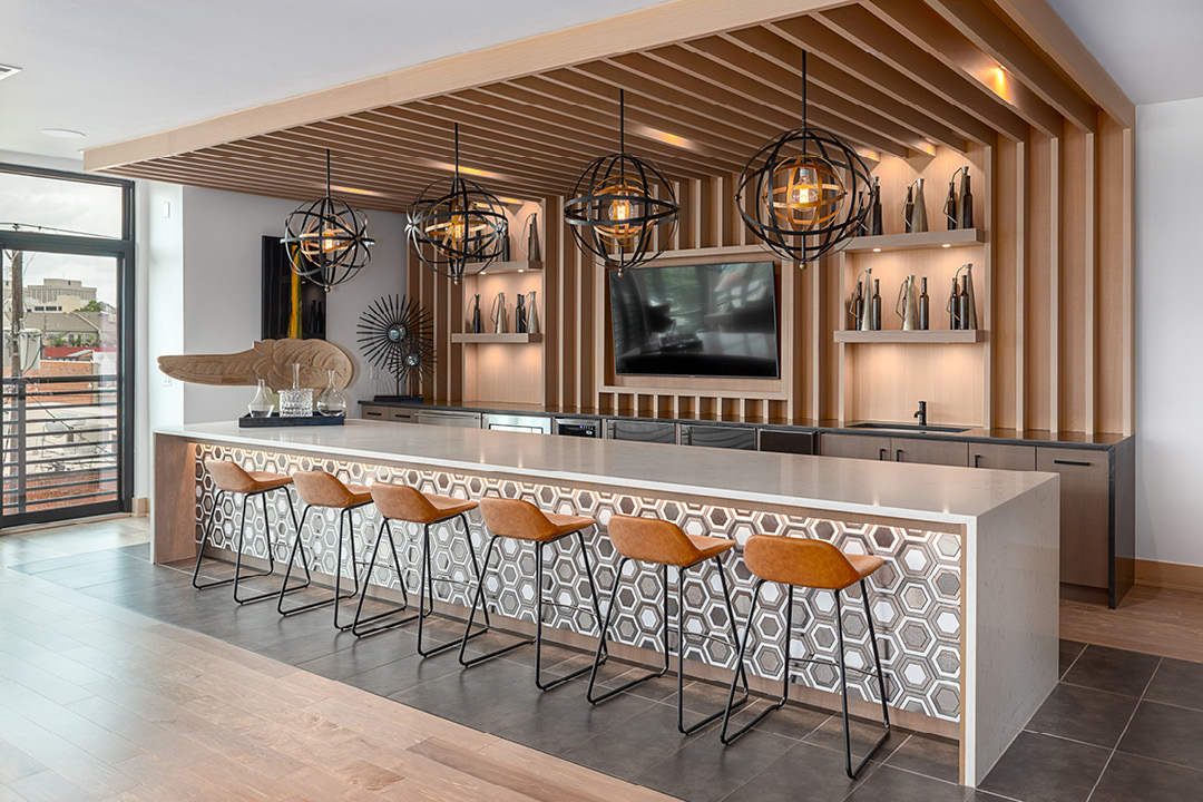 Indie Deep Ellum is a mixed-use building comprised of eight stories that spans a site a little over one acre. The entire site contains 231 residential units that cover almost 200,000 square feet alone. The 297 parking spots are divided with one level below grade for residents, a few surface level spots for future residents and management, and a 2nd level garage for retail customers and residents. A decorative breezeway on the ground level serves to separate the retail spaces from the eight ground floor units and amenity spaces. The amenities on the ground level contain a modern yet industrial fitness center, leasing office, conference rooms, an artist studio, and package locker rooms. Above the second level parking brings you to the residential building which contains apartment units that wrap the south facing garden courtyard and the north facing pool courtyard. The courtyards contain grilling stations, ping pong tables, and a pool lounge. Directly adjacent to the pool is a clubhouse with a game area, modern kitchen, and a movie lounge.