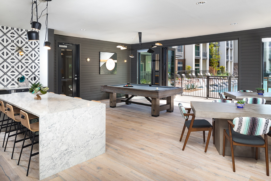 The 4-story complex contains 353 one, two, and three-bedroom units ranging from 642 to 1,405 square feet. Crestview Commons also includes numerous amenities such as a dog park, a resort-style pool with grilling areas, a relaxation courtyard, and a rooftop lounge with views of downtown Austin.