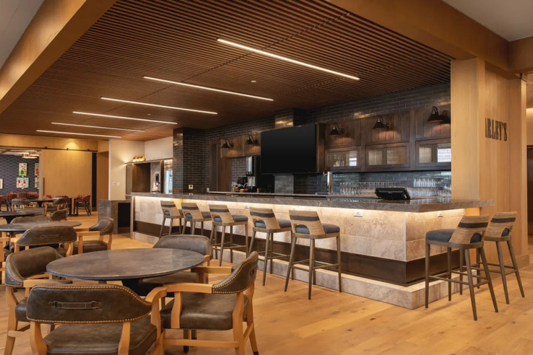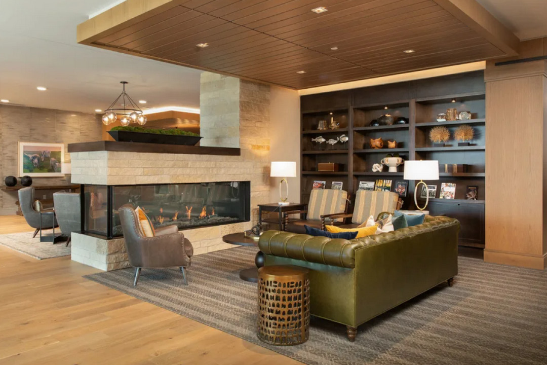 The Assisted Living and Memory Care Building (Building 5) is a five-level structure constructed of one load-bearing metal stud upper level over four levels of concrete frame infilled with metal studs on a structural foundation with piers. This dedicated structure comprises 116 units, including 84 Assisted Living units and 32 Memory Care residences. Level one hosts the commercial kitchen, dining spaces, and community gathering areas on all levels. It features four warming pantries through the upper levels, six interior fireplaces, a salon/barbershop for residents' convenience, and an exercise room. Exiting Level two reveals two courtyards at each end of the building, offering residents tranquil outdoor spaces with a combination of seating areas and plants.