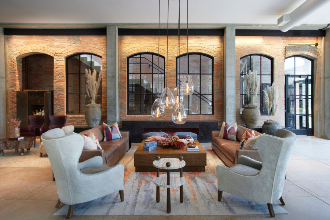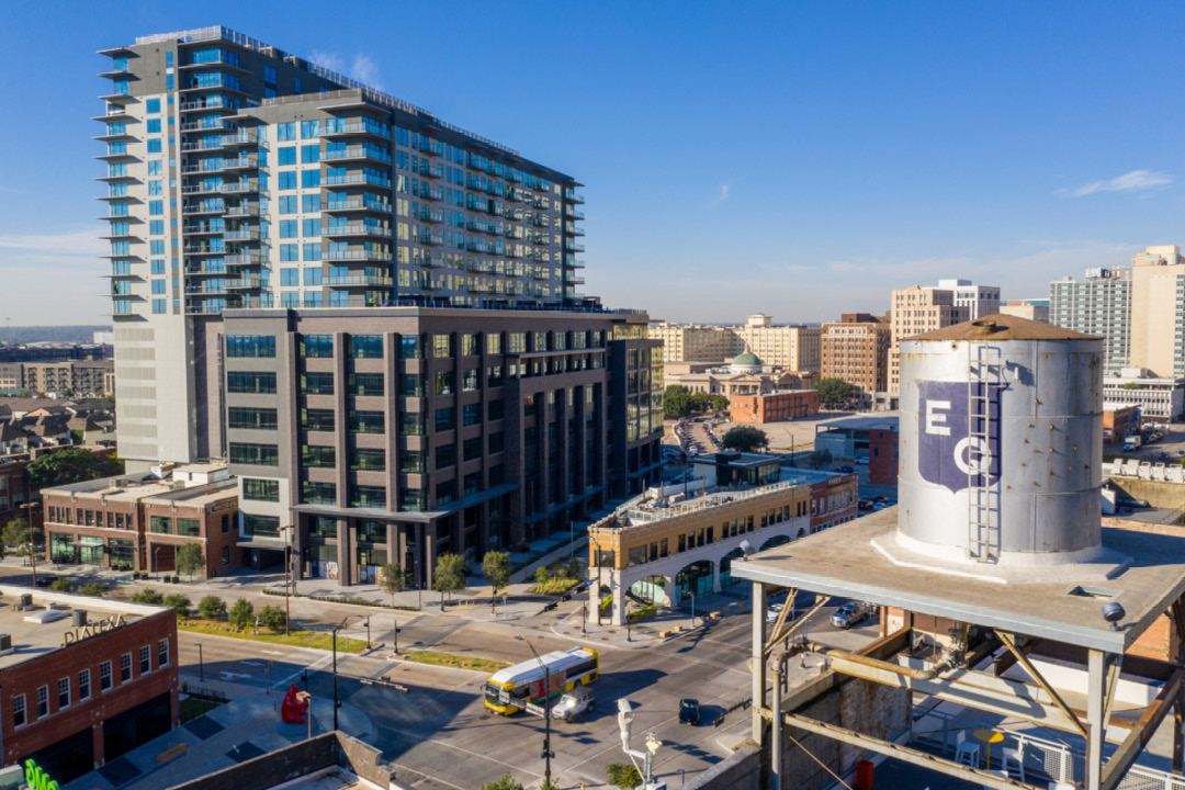The 20-story mixed-use tower includes 336 apartments, 180,000 square feet of office space, 25,000 square feet of ground-floor retail, a fitness center, and a private bar for tenants. This project preserved two buildings from the 1940s.